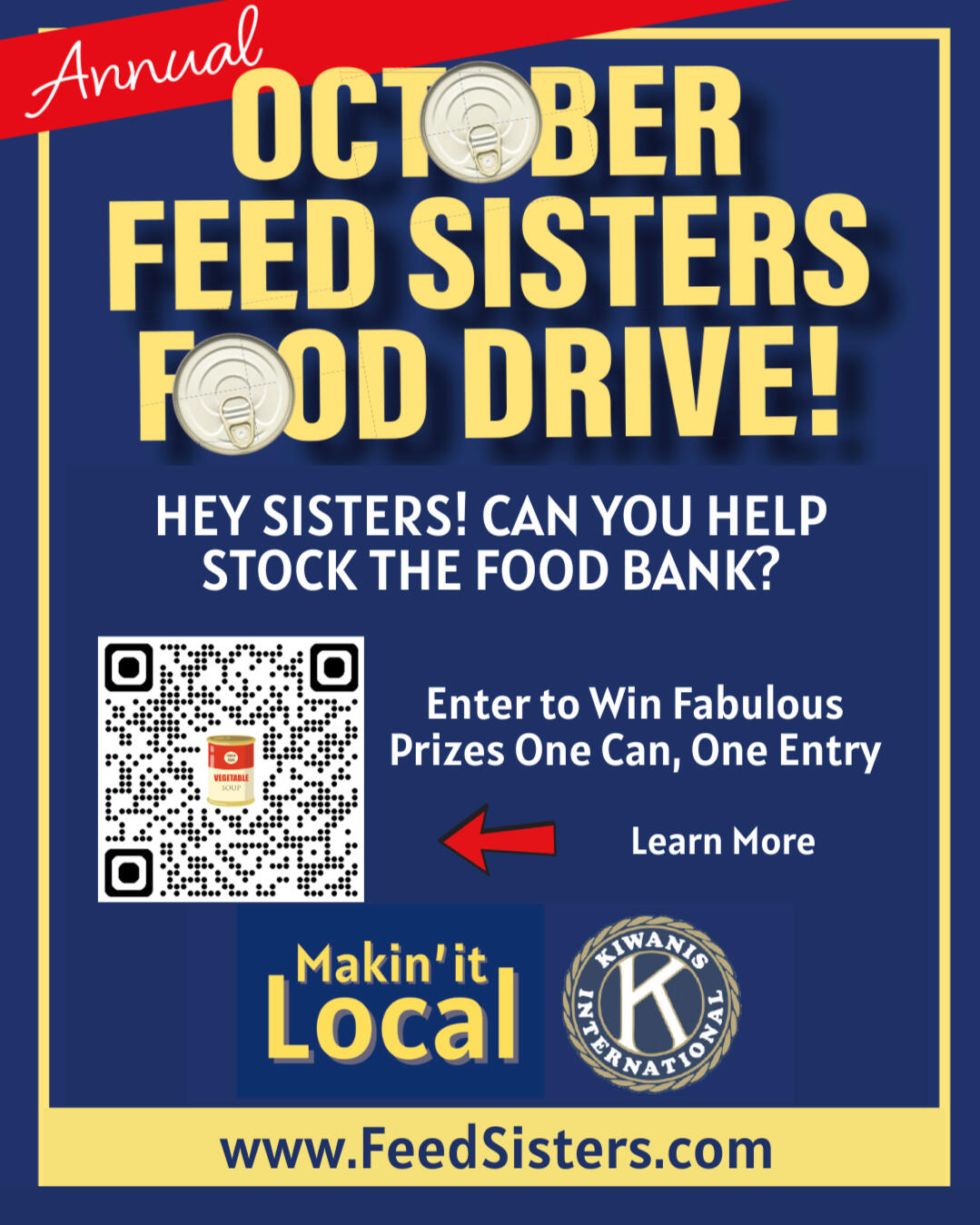 Can't get to Makin' it Local in person? No worries, you can donate money online. Donate to the Kiwanis Food Bank, note “Feed Sisters Food Drive,” and email your donation screenshot by Oct 31 @ 5 PM to enter our raffle! Call us if you have questions - 541-904-4722. Thanks!